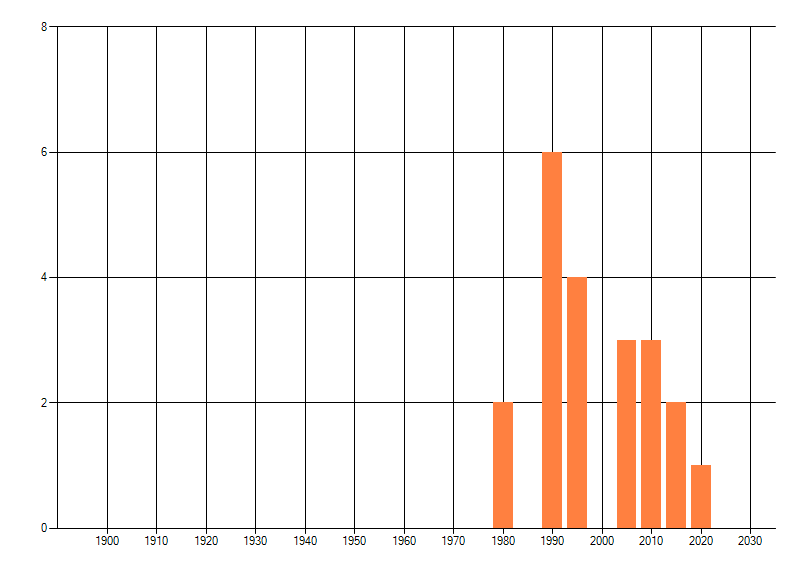 Het aantal atlasblokken (5x5 km) waarin de soort is gemeld binnen een periode van vijf jaar (vanaf 1980) of twintig jaar. Niet gecorrigeerd voor waarnemersinspanning en het aantal doorgegeven waarnemingen kan sterk variëren per periode, dus een trend in verspreiding kan hier niet direct uit worden afgelezen. Het opgegeven jaartal is het eerste jaar van de periode. Bron: gevalideerde waarnemingen uit de NDFF.