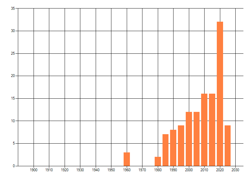 Het aantal atlasblokken (5x5 km) waarin de soort is gemeld binnen een periode van vijf jaar (vanaf 1980) of twintig jaar. Niet gecorrigeerd voor waarnemersinspanning en het aantal doorgegeven waarnemingen kan sterk variëren per periode, dus een trend in verspreiding kan hier niet direct uit worden afgelezen. Het opgegeven jaartal is het eerste jaar van de periode. Bron: gevalideerde waarnemingen uit de NDFF.