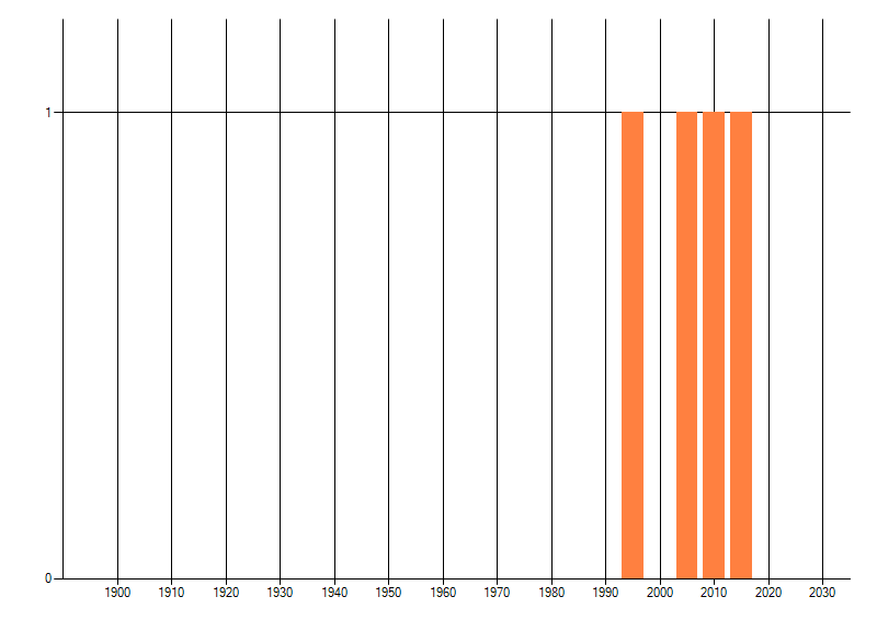 Het aantal atlasblokken (5x5 km) waarin de soort is gemeld binnen een periode van vijf jaar (vanaf 1980) of twintig jaar. Niet gecorrigeerd voor waarnemersinspanning en het aantal doorgegeven waarnemingen kan sterk variëren per periode, dus een trend in verspreiding kan hier niet direct uit worden afgelezen. Het opgegeven jaartal is het eerste jaar van de periode. Bron: gevalideerde waarnemingen uit de NDFF.