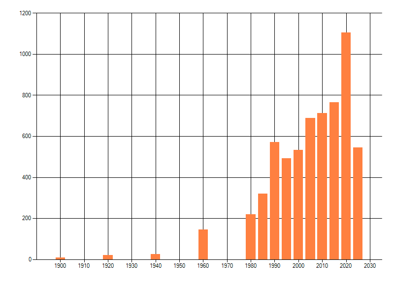 Het aantal atlasblokken (5x5 km) waarin de soort is gemeld binnen een periode van vijf jaar (vanaf 1980) of twintig jaar. Niet gecorrigeerd voor waarnemersinspanning en het aantal doorgegeven waarnemingen kan sterk variëren per periode, dus een trend in verspreiding kan hier niet direct uit worden afgelezen. Het opgegeven jaartal is het eerste jaar van de periode. Bron: gevalideerde waarnemingen uit de NDFF.
