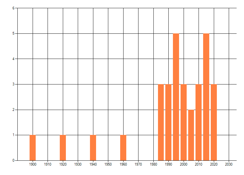 Het aantal atlasblokken (5x5 km) waarin de soort is gemeld binnen een periode van vijf jaar (vanaf 1980) of twintig jaar. Niet gecorrigeerd voor waarnemersinspanning en het aantal doorgegeven waarnemingen kan sterk variëren per periode, dus een trend in verspreiding kan hier niet direct uit worden afgelezen. Het opgegeven jaartal is het eerste jaar van de periode. Bron: gevalideerde waarnemingen uit de NDFF.