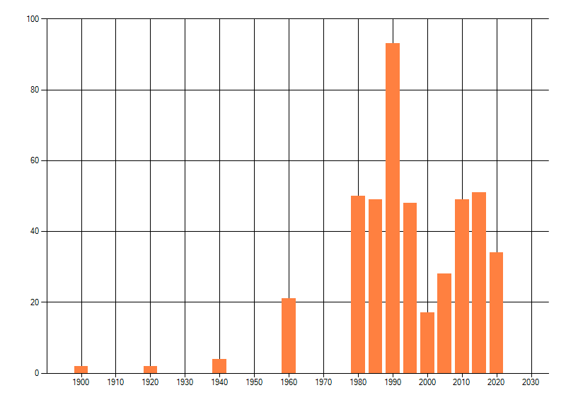 Het aantal atlasblokken (5x5 km) waarin de soort is gemeld binnen een periode van vijf jaar (vanaf 1980) of twintig jaar. Niet gecorrigeerd voor waarnemersinspanning en het aantal doorgegeven waarnemingen kan sterk variëren per periode, dus een trend in verspreiding kan hier niet direct uit worden afgelezen. Het opgegeven jaartal is het eerste jaar van de periode. Bron: gevalideerde waarnemingen uit de NDFF.