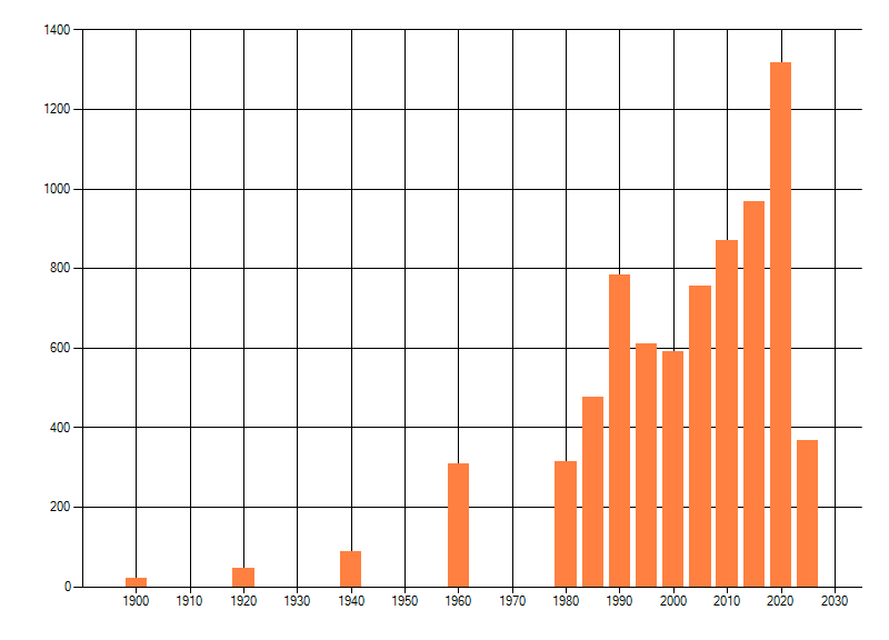 Het aantal atlasblokken (5x5 km) waarin de soort is gemeld binnen een periode van vijf jaar (vanaf 1980) of twintig jaar. Niet gecorrigeerd voor waarnemersinspanning en het aantal doorgegeven waarnemingen kan sterk variëren per periode, dus een trend in verspreiding kan hier niet direct uit worden afgelezen. Het opgegeven jaartal is het eerste jaar van de periode. Bron: gevalideerde waarnemingen uit de NDFF.
