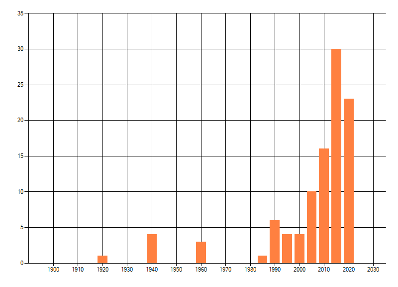 Het aantal atlasblokken (5x5 km) waarin de soort is gemeld binnen een periode van vijf jaar (vanaf 1980) of twintig jaar. Niet gecorrigeerd voor waarnemersinspanning en het aantal doorgegeven waarnemingen kan sterk variëren per periode, dus een trend in verspreiding kan hier niet direct uit worden afgelezen. Het opgegeven jaartal is het eerste jaar van de periode. Bron: gevalideerde waarnemingen uit de NDFF.