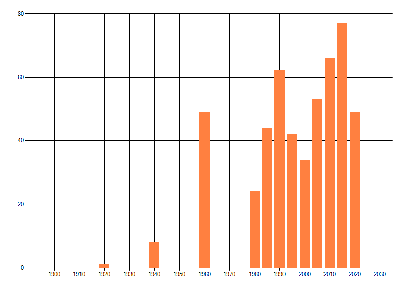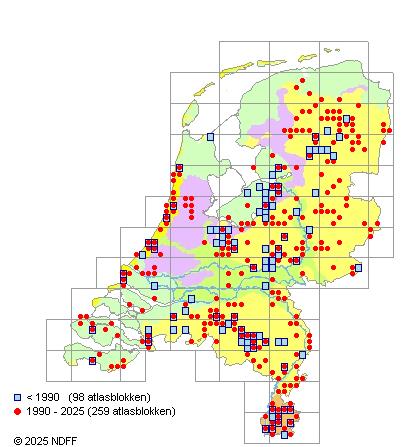 Het aantal atlasblokken (5x5 km) waarin de soort is gemeld binnen een periode van vijf jaar (vanaf 1980) of twintig jaar. Niet gecorrigeerd voor waarnemersinspanning en het aantal doorgegeven waarnemingen kan sterk variëren per periode, dus een trend in verspreiding kan hier niet direct uit worden afgelezen. Het opgegeven jaartal is het eerste jaar van de periode. Bron: gevalideerde waarnemingen uit de NDFF.