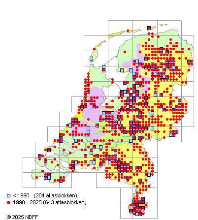 Het aantal atlasblokken (5x5 km) waarin de soort is gemeld binnen een periode van vijf jaar (vanaf 1980) of twintig jaar. Niet gecorrigeerd voor waarnemersinspanning en het aantal doorgegeven waarnemingen kan sterk variëren per periode, dus een trend in verspreiding kan hier niet direct uit worden afgelezen. Het opgegeven jaartal is het eerste jaar van de periode. Bron: gevalideerde waarnemingen uit de NDFF.