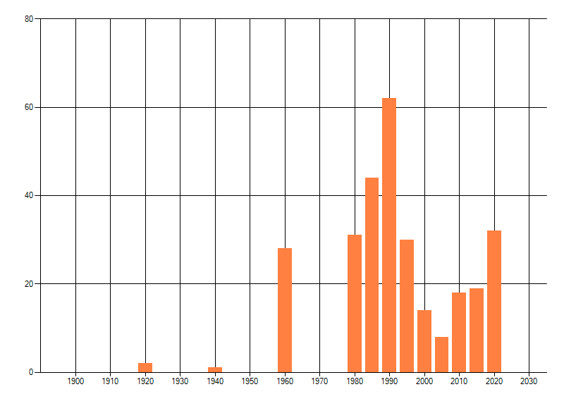 Het aantal atlasblokken (5x5 km) waarin de soort is gemeld binnen een periode van vijf jaar (vanaf 1980) of twintig jaar. Niet gecorrigeerd voor waarnemersinspanning en het aantal doorgegeven waarnemingen kan sterk variëren per periode, dus een trend in verspreiding kan hier niet direct uit worden afgelezen. Het opgegeven jaartal is het eerste jaar van de periode. Bron: gevalideerde waarnemingen uit de NDFF.