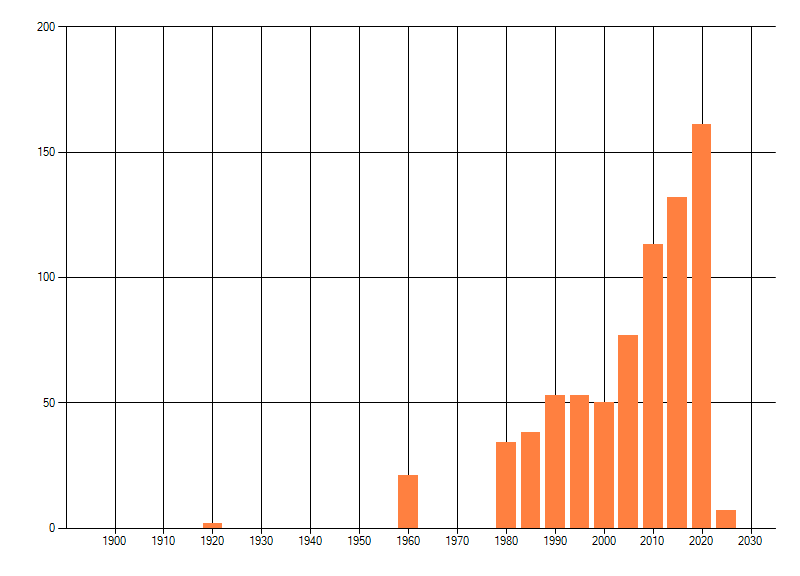 Het aantal atlasblokken (5x5 km) waarin de soort is gemeld binnen een periode van vijf jaar (vanaf 1980) of twintig jaar. Niet gecorrigeerd voor waarnemersinspanning en het aantal doorgegeven waarnemingen kan sterk variëren per periode, dus een trend in verspreiding kan hier niet direct uit worden afgelezen. Het opgegeven jaartal is het eerste jaar van de periode. Bron: gevalideerde waarnemingen uit de NDFF.