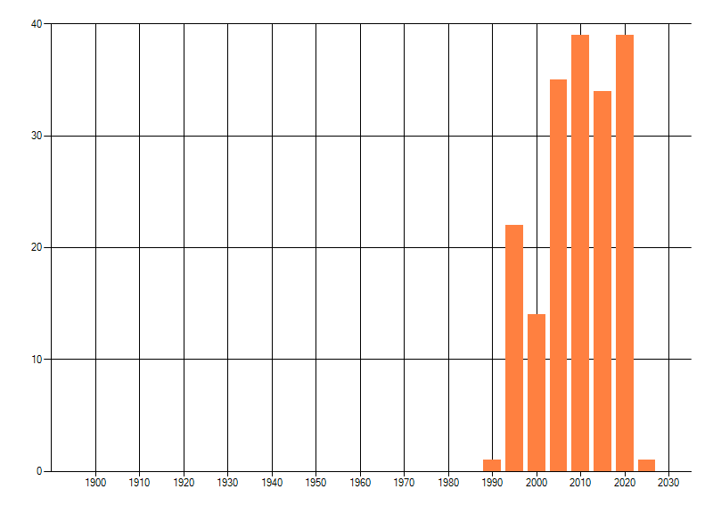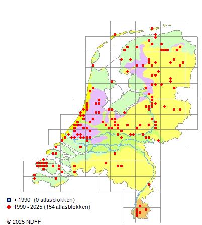 Het aantal atlasblokken (5x5 km) waarin de soort is gemeld binnen een periode van vijf jaar (vanaf 1980) of twintig jaar. Niet gecorrigeerd voor waarnemersinspanning en het aantal doorgegeven waarnemingen kan sterk variëren per periode, dus een trend in verspreiding kan hier niet direct uit worden afgelezen. Het opgegeven jaartal is het eerste jaar van de periode. Bron: gevalideerde waarnemingen uit de NDFF.
