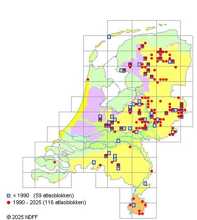 Het aantal atlasblokken (5x5 km) waarin de soort is gemeld binnen een periode van vijf jaar (vanaf 1980) of twintig jaar. Niet gecorrigeerd voor waarnemersinspanning en het aantal doorgegeven waarnemingen kan sterk variëren per periode, dus een trend in verspreiding kan hier niet direct uit worden afgelezen. Het opgegeven jaartal is het eerste jaar van de periode. Bron: gevalideerde waarnemingen uit de NDFF.