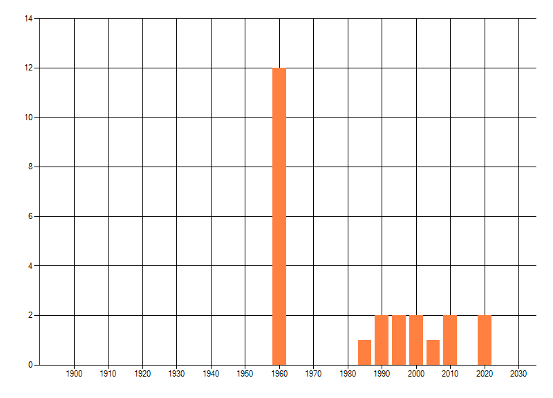 Het aantal atlasblokken (5x5 km) waarin de soort is gemeld binnen een periode van vijf jaar (vanaf 1980) of twintig jaar. Niet gecorrigeerd voor waarnemersinspanning en het aantal doorgegeven waarnemingen kan sterk variëren per periode, dus een trend in verspreiding kan hier niet direct uit worden afgelezen. Het opgegeven jaartal is het eerste jaar van de periode. Bron: gevalideerde waarnemingen uit de NDFF.