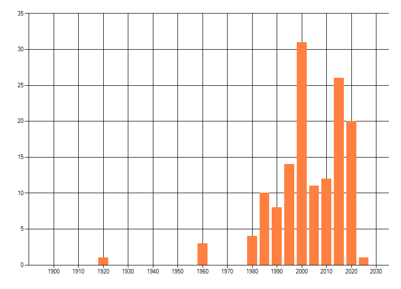 Het aantal atlasblokken (5x5 km) waarin de soort is gemeld binnen een periode van vijf jaar (vanaf 1980) of twintig jaar. Niet gecorrigeerd voor waarnemersinspanning en het aantal doorgegeven waarnemingen kan sterk variëren per periode, dus een trend in verspreiding kan hier niet direct uit worden afgelezen. Het opgegeven jaartal is het eerste jaar van de periode. Bron: gevalideerde waarnemingen uit de NDFF.