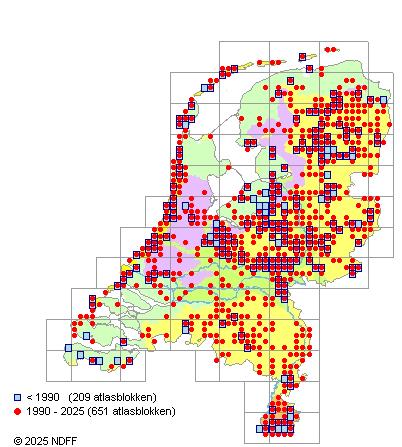 Het aantal atlasblokken (5x5 km) waarin de soort is gemeld binnen een periode van vijf jaar (vanaf 1980) of twintig jaar. Niet gecorrigeerd voor waarnemersinspanning en het aantal doorgegeven waarnemingen kan sterk variëren per periode, dus een trend in verspreiding kan hier niet direct uit worden afgelezen. Het opgegeven jaartal is het eerste jaar van de periode. Bron: gevalideerde waarnemingen uit de NDFF.