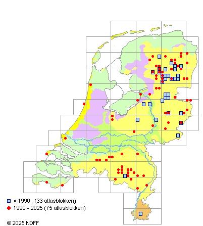 Het aantal atlasblokken (5x5 km) waarin de soort is gemeld binnen een periode van vijf jaar (vanaf 1980) of twintig jaar. Niet gecorrigeerd voor waarnemersinspanning en het aantal doorgegeven waarnemingen kan sterk variëren per periode, dus een trend in verspreiding kan hier niet direct uit worden afgelezen. Het opgegeven jaartal is het eerste jaar van de periode. Bron: gevalideerde waarnemingen uit de NDFF.