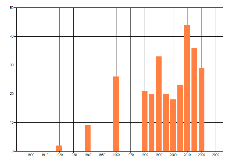Het aantal atlasblokken (5x5 km) waarin de soort is gemeld binnen een periode van vijf jaar (vanaf 1980) of twintig jaar. Niet gecorrigeerd voor waarnemersinspanning en het aantal doorgegeven waarnemingen kan sterk variëren per periode, dus een trend in verspreiding kan hier niet direct uit worden afgelezen. Het opgegeven jaartal is het eerste jaar van de periode. Bron: gevalideerde waarnemingen uit de NDFF.