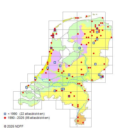 Het aantal atlasblokken (5x5 km) waarin de soort is gemeld binnen een periode van vijf jaar (vanaf 1980) of twintig jaar. Niet gecorrigeerd voor waarnemersinspanning en het aantal doorgegeven waarnemingen kan sterk variëren per periode, dus een trend in verspreiding kan hier niet direct uit worden afgelezen. Het opgegeven jaartal is het eerste jaar van de periode. Bron: gevalideerde waarnemingen uit de NDFF.