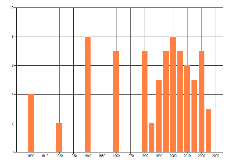 Het aantal atlasblokken (5x5 km) waarin de soort is gemeld binnen een periode van vijf jaar (vanaf 1980) of twintig jaar. Niet gecorrigeerd voor waarnemersinspanning en het aantal doorgegeven waarnemingen kan sterk variëren per periode, dus een trend in verspreiding kan hier niet direct uit worden afgelezen. Het opgegeven jaartal is het eerste jaar van de periode. Bron: gevalideerde waarnemingen uit de NDFF.