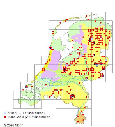 Het aantal atlasblokken (5x5 km) waarin de soort is gemeld binnen een periode van vijf jaar (vanaf 1980) of twintig jaar. Niet gecorrigeerd voor waarnemersinspanning en het aantal doorgegeven waarnemingen kan sterk variëren per periode, dus een trend in verspreiding kan hier niet direct uit worden afgelezen. Het opgegeven jaartal is het eerste jaar van de periode. Bron: gevalideerde waarnemingen uit de NDFF.