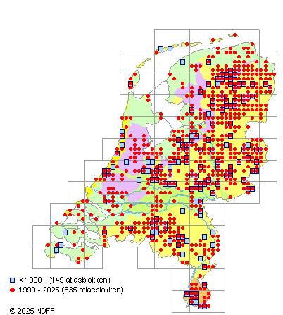 Het aantal atlasblokken (5x5 km) waarin de soort is gemeld binnen een periode van vijf jaar (vanaf 1980) of twintig jaar. Niet gecorrigeerd voor waarnemersinspanning en het aantal doorgegeven waarnemingen kan sterk variëren per periode, dus een trend in verspreiding kan hier niet direct uit worden afgelezen. Het opgegeven jaartal is het eerste jaar van de periode. Bron: gevalideerde waarnemingen uit de NDFF.