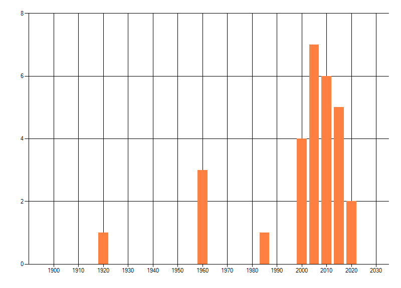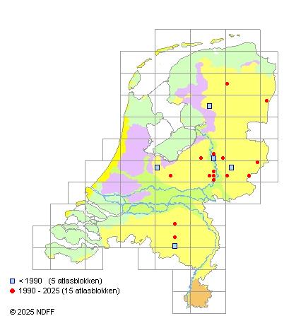 Het aantal atlasblokken (5x5 km) waarin de soort is gemeld binnen een periode van vijf jaar (vanaf 1980) of twintig jaar. Niet gecorrigeerd voor waarnemersinspanning en het aantal doorgegeven waarnemingen kan sterk variëren per periode, dus een trend in verspreiding kan hier niet direct uit worden afgelezen. Het opgegeven jaartal is het eerste jaar van de periode. Bron: gevalideerde waarnemingen uit de NDFF.