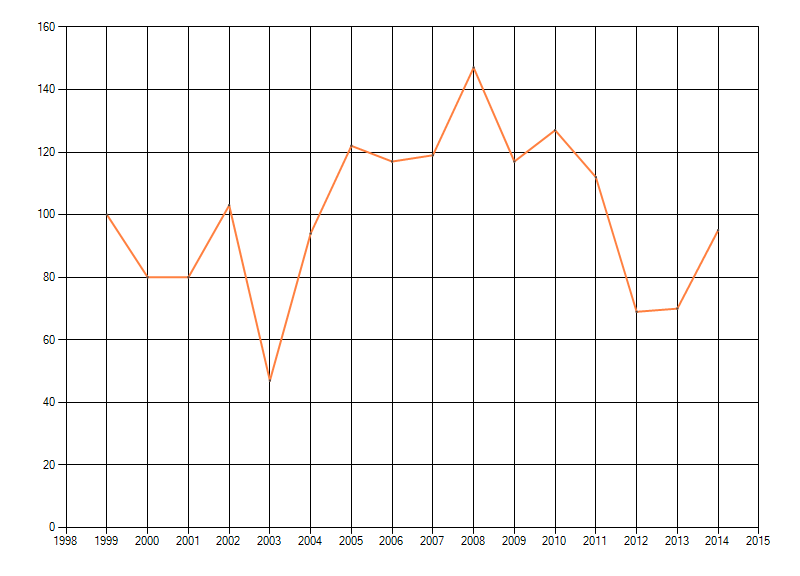 Trend in het geschatte aantal individuen van paddenstoelen in bossen op de hoge zandgronden, weergegeven als indexcijfer (eerste jaar = 100). Bron:
