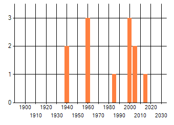 Het aantal atlasblokken (5x5 km) waarin de soort is gemeld binnen een periode van vijf jaar (vanaf 1980) of twintig jaar. Niet gecorrigeerd voor waarnemersinspanning en het aantal doorgegeven waarnemingen kan sterk variëren per periode, dus een trend in verspreiding kan hier niet direct uit worden afgelezen. Het opgegeven jaartal is het eerste jaar van de periode. Bron: gevalideerde waarnemingen uit de NDFF.
