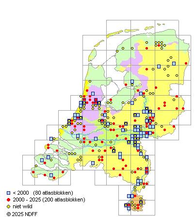 Het aantal atlasblokken (5x5 km) waarin de soort is gemeld binnen een periode van vijf jaar (vanaf 1980) of twintig jaar. Niet gecorrigeerd voor waarnemersinspanning en het aantal doorgegeven waarnemingen kan sterk variëren per periode, dus een trend in verspreiding kan hier niet direct uit worden afgelezen. Het opgegeven jaartal is het eerste jaar van de periode. Bron: gevalideerde waarnemingen uit de NDFF.