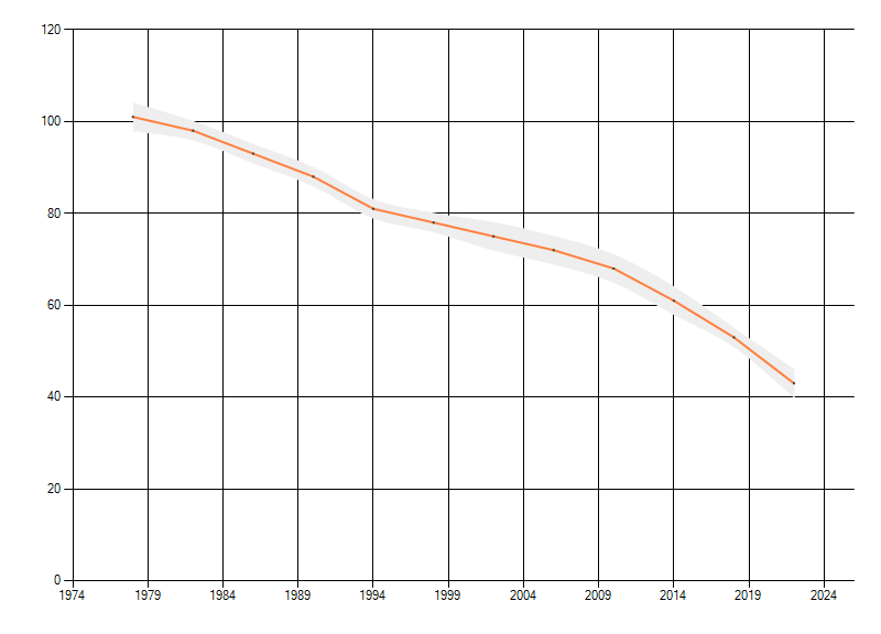 Gemiddelde trend van het aantal kilometerhokken waarin de soort voorkomt, weergegeven als indexcijfer (1975-1978 = 100).