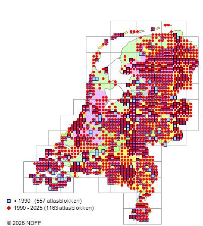 Het aantal atlasblokken (5x5 km) waarin de soort is gemeld binnen een periode van vijf jaar (vanaf 1980) of twintig jaar. Niet gecorrigeerd voor waarnemersinspanning en het aantal doorgegeven waarnemingen kan sterk variëren per periode, dus een trend in verspreiding kan hier niet direct uit worden afgelezen. Het opgegeven jaartal is het eerste jaar van de periode. Bron: gevalideerde waarnemingen uit de NDFF.