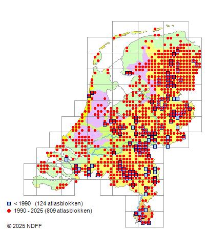 Het aantal atlasblokken (5x5 km) waarin de soort is gemeld binnen een periode van vijf jaar (vanaf 1980) of twintig jaar. Niet gecorrigeerd voor waarnemersinspanning en het aantal doorgegeven waarnemingen kan sterk variëren per periode, dus een trend in verspreiding kan hier niet direct uit worden afgelezen. Het opgegeven jaartal is het eerste jaar van de periode. Bron: gevalideerde waarnemingen uit de NDFF.