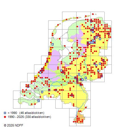Het aantal atlasblokken (5x5 km) waarin de soort is gemeld binnen een periode van vijf jaar (vanaf 1980) of twintig jaar. Niet gecorrigeerd voor waarnemersinspanning en het aantal doorgegeven waarnemingen kan sterk variëren per periode, dus een trend in verspreiding kan hier niet direct uit worden afgelezen. Het opgegeven jaartal is het eerste jaar van de periode. Bron: gevalideerde waarnemingen uit de NDFF.