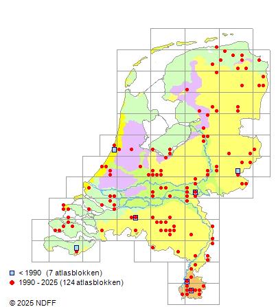 Het aantal atlasblokken (5x5 km) waarin de soort is gemeld binnen een periode van vijf jaar (vanaf 1980) of twintig jaar. Niet gecorrigeerd voor waarnemersinspanning en het aantal doorgegeven waarnemingen kan sterk variëren per periode, dus een trend in verspreiding kan hier niet direct uit worden afgelezen. Het opgegeven jaartal is het eerste jaar van de periode. Bron: gevalideerde waarnemingen uit de NDFF.
