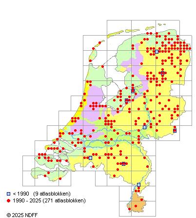 Het aantal atlasblokken (5x5 km) waarin de soort is gemeld binnen een periode van vijf jaar (vanaf 1980) of twintig jaar. Niet gecorrigeerd voor waarnemersinspanning en het aantal doorgegeven waarnemingen kan sterk variëren per periode, dus een trend in verspreiding kan hier niet direct uit worden afgelezen. Het opgegeven jaartal is het eerste jaar van de periode. Bron: gevalideerde waarnemingen uit de NDFF.