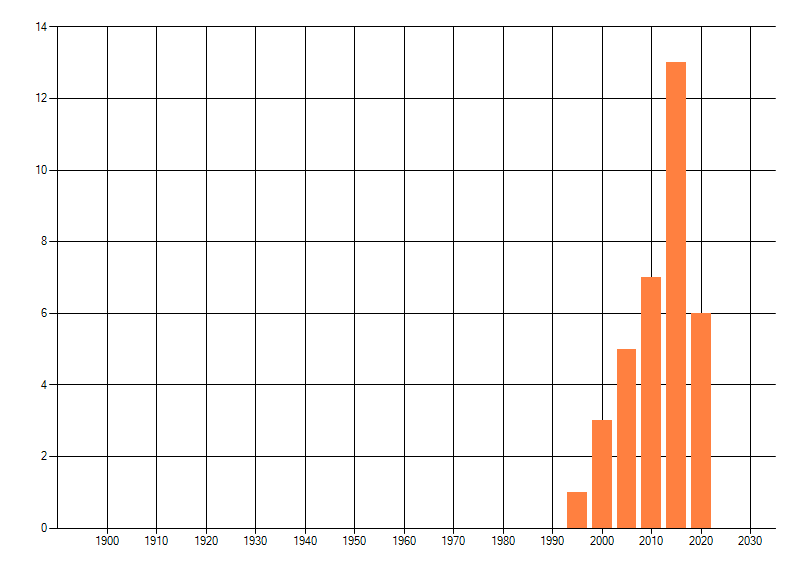 Het aantal atlasblokken (5x5 km) waarin de soort is gemeld binnen een periode van vijf jaar (vanaf 1980) of twintig jaar. Niet gecorrigeerd voor waarnemersinspanning en het aantal doorgegeven waarnemingen kan sterk variëren per periode, dus een trend in verspreiding kan hier niet direct uit worden afgelezen. Het opgegeven jaartal is het eerste jaar van de periode. Bron: gevalideerde waarnemingen uit de NDFF.