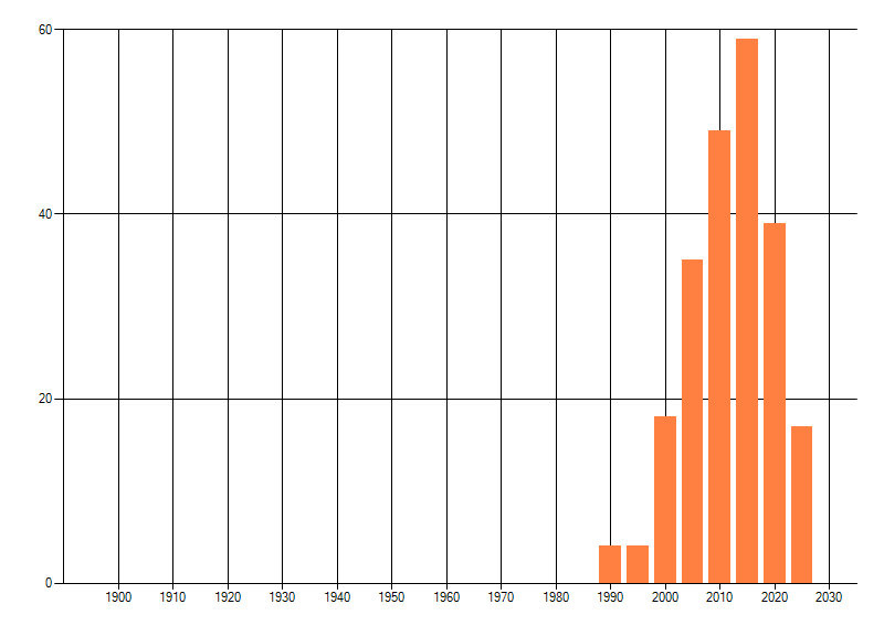 Het aantal atlasblokken (5x5 km) waarin de soort is gemeld binnen een periode van vijf jaar (vanaf 1980) of twintig jaar. Niet gecorrigeerd voor waarnemersinspanning en het aantal doorgegeven waarnemingen kan sterk variëren per periode, dus een trend in verspreiding kan hier niet direct uit worden afgelezen. Het opgegeven jaartal is het eerste jaar van de periode. Bron: gevalideerde waarnemingen uit de NDFF.
