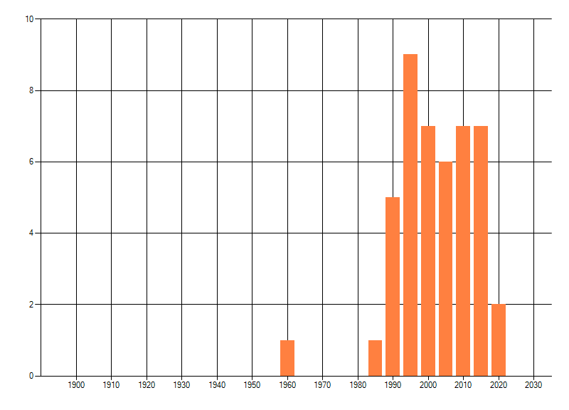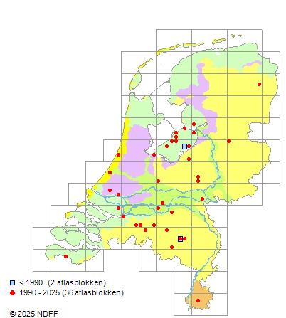 Het aantal atlasblokken (5x5 km) waarin de soort is gemeld binnen een periode van vijf jaar (vanaf 1980) of twintig jaar. Niet gecorrigeerd voor waarnemersinspanning en het aantal doorgegeven waarnemingen kan sterk variëren per periode, dus een trend in verspreiding kan hier niet direct uit worden afgelezen. Het opgegeven jaartal is het eerste jaar van de periode. Bron: gevalideerde waarnemingen uit de NDFF.