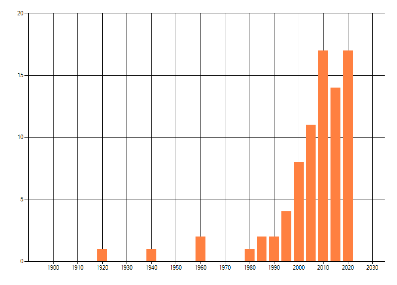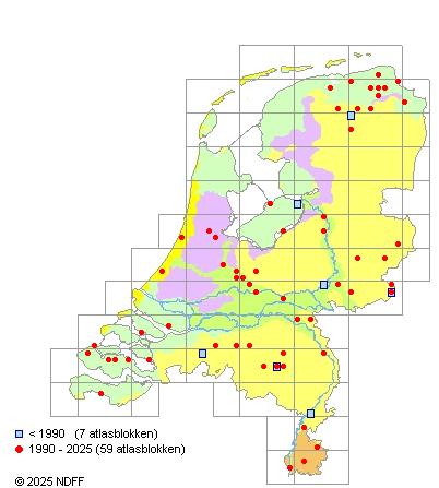 Het aantal atlasblokken (5x5 km) waarin de soort is gemeld binnen een periode van vijf jaar (vanaf 1980) of twintig jaar. Niet gecorrigeerd voor waarnemersinspanning en het aantal doorgegeven waarnemingen kan sterk variëren per periode, dus een trend in verspreiding kan hier niet direct uit worden afgelezen. Het opgegeven jaartal is het eerste jaar van de periode. Bron: gevalideerde waarnemingen uit de NDFF.