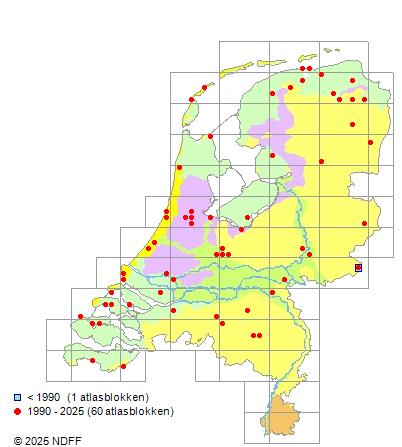 Het aantal atlasblokken (5x5 km) waarin de soort is gemeld binnen een periode van vijf jaar (vanaf 1980) of twintig jaar. Niet gecorrigeerd voor waarnemersinspanning en het aantal doorgegeven waarnemingen kan sterk variëren per periode, dus een trend in verspreiding kan hier niet direct uit worden afgelezen. Het opgegeven jaartal is het eerste jaar van de periode. Bron: gevalideerde waarnemingen uit de NDFF.