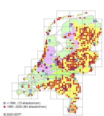 Het aantal atlasblokken (5x5 km) waarin de soort is gemeld binnen een periode van vijf jaar (vanaf 1980) of twintig jaar. Niet gecorrigeerd voor waarnemersinspanning en het aantal doorgegeven waarnemingen kan sterk variëren per periode, dus een trend in verspreiding kan hier niet direct uit worden afgelezen. Het opgegeven jaartal is het eerste jaar van de periode. Bron: gevalideerde waarnemingen uit de NDFF.