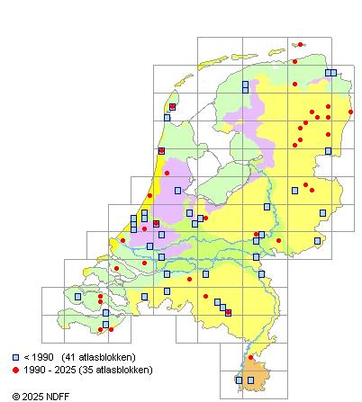 Het aantal atlasblokken (5x5 km) waarin de soort is gemeld binnen een periode van vijf jaar (vanaf 1980) of twintig jaar. Niet gecorrigeerd voor waarnemersinspanning en het aantal doorgegeven waarnemingen kan sterk variëren per periode, dus een trend in verspreiding kan hier niet direct uit worden afgelezen. Het opgegeven jaartal is het eerste jaar van de periode. Bron: gevalideerde waarnemingen uit de NDFF.