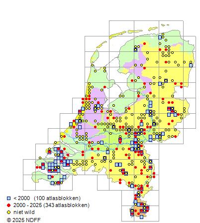 Het aantal atlasblokken (5x5 km) waarin de soort is gemeld binnen een periode van vijf jaar (vanaf 1980) of twintig jaar.
