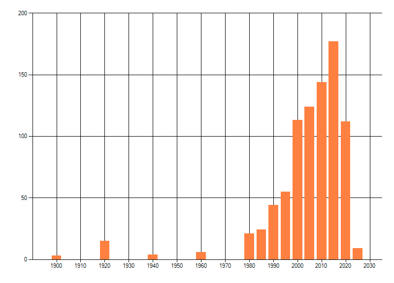 Het aantal atlasblokken (5x5 km) waarin de soort is gemeld binnen een periode van vijf jaar (vanaf 1980) of twintig jaar. Niet gecorrigeerd voor waarnemersinspanning en het aantal doorgegeven waarnemingen kan sterk variëren per periode, dus een trend in verspreiding kan hier niet direct uit worden afgelezen. Het opgegeven jaartal is het eerste jaar van de periode. Bron: gevalideerde waarnemingen uit de NDFF.