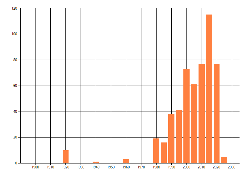 Het aantal atlasblokken (5x5 km) waarin de soort is gemeld binnen een periode van vijf jaar (vanaf 1980) of twintig jaar. Niet gecorrigeerd voor waarnemersinspanning en het aantal doorgegeven waarnemingen kan sterk variëren per periode, dus een trend in verspreiding kan hier niet direct uit worden afgelezen. Het opgegeven jaartal is het eerste jaar van de periode. Bron: gevalideerde waarnemingen uit de NDFF.