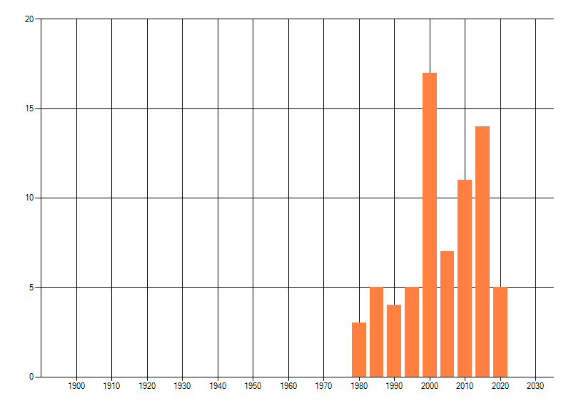 Het aantal atlasblokken (5x5 km) waarin de soort is gemeld binnen een periode van vijf jaar (vanaf 1980) of twintig jaar. Niet gecorrigeerd voor waarnemersinspanning en het aantal doorgegeven waarnemingen kan sterk variëren per periode, dus een trend in verspreiding kan hier niet direct uit worden afgelezen. Het opgegeven jaartal is het eerste jaar van de periode. Bron: gevalideerde waarnemingen uit de NDFF.