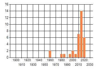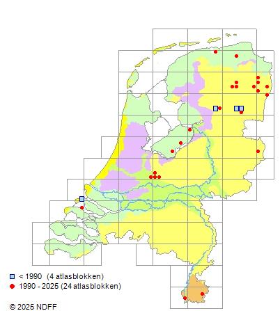 Het aantal atlasblokken (5x5 km) waarin de soort is gemeld binnen een periode van vijf jaar (vanaf 1980) of twintig jaar. Niet gecorrigeerd voor waarnemersinspanning en het aantal doorgegeven waarnemingen kan sterk variëren per periode, dus een trend in verspreiding kan hier niet direct uit worden afgelezen. Het opgegeven jaartal is het eerste jaar van de periode. Bron: gevalideerde waarnemingen uit de NDFF.