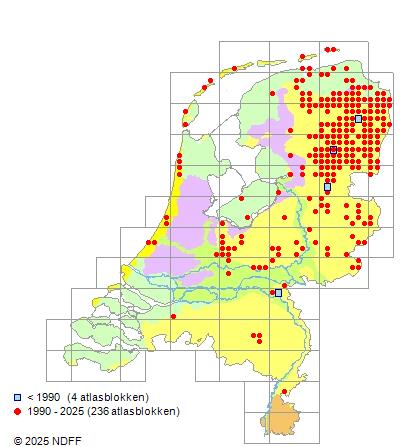 Het aantal atlasblokken (5x5 km) waarin de soort is gemeld binnen een periode van vijf jaar (vanaf 1980) of twintig jaar. Niet gecorrigeerd voor waarnemersinspanning en het aantal doorgegeven waarnemingen kan sterk variëren per periode, dus een trend in verspreiding kan hier niet direct uit worden afgelezen. Het opgegeven jaartal is het eerste jaar van de periode. Bron: gevalideerde waarnemingen uit de NDFF.