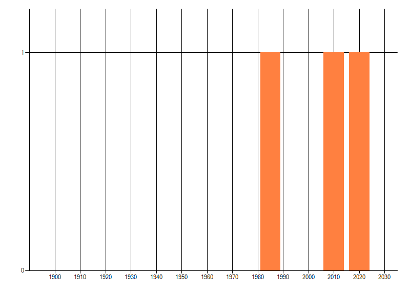 Het aantal atlasblokken (5x5 km) waarin de soort is gemeld binnen een periode van vijf jaar (vanaf 1980) of twintig jaar. Niet gecorrigeerd voor waarnemersinspanning en het aantal doorgegeven waarnemingen kan sterk variëren per periode, dus een trend in verspreiding kan hier niet direct uit worden afgelezen. Het opgegeven jaartal is het eerste jaar van de periode. Bron: gevalideerde waarnemingen uit de NDFF.
