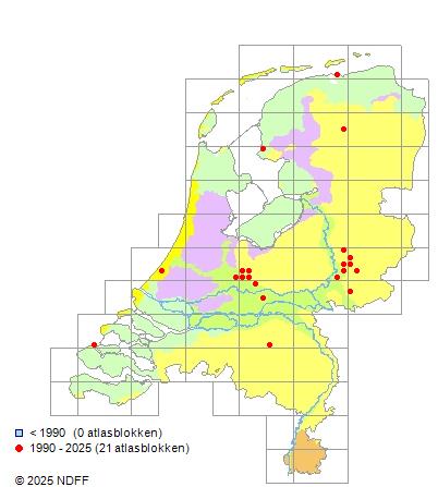Het aantal atlasblokken (5x5 km) waarin de soort is gemeld binnen een periode van vijf jaar (vanaf 1980) of twintig jaar. Niet gecorrigeerd voor waarnemersinspanning en het aantal doorgegeven waarnemingen kan sterk variëren per periode, dus een trend in verspreiding kan hier niet direct uit worden afgelezen. Het opgegeven jaartal is het eerste jaar van de periode. Bron: gevalideerde waarnemingen uit de NDFF.