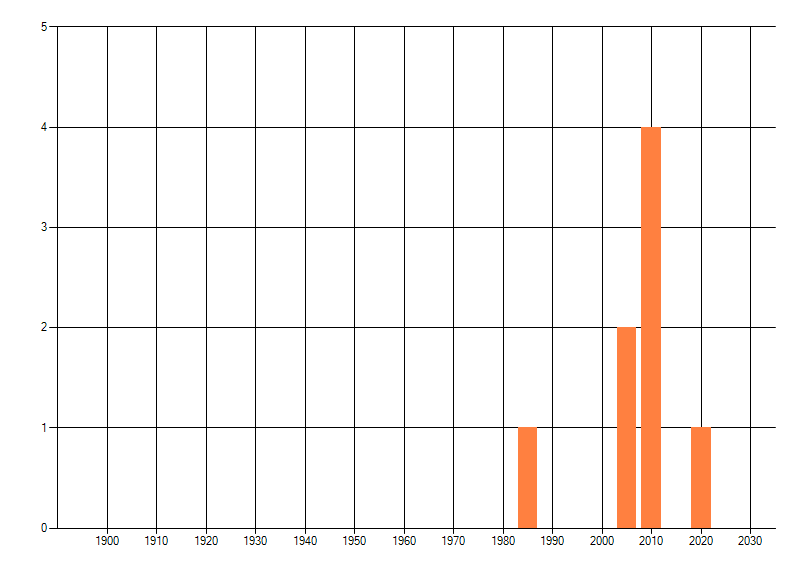 Het aantal atlasblokken (5x5 km) waarin de soort is gemeld binnen een periode van vijf jaar (vanaf 1980) of twintig jaar. Niet gecorrigeerd voor waarnemersinspanning en het aantal doorgegeven waarnemingen kan sterk variëren per periode, dus een trend in verspreiding kan hier niet direct uit worden afgelezen. Het opgegeven jaartal is het eerste jaar van de periode. Bron: gevalideerde waarnemingen uit de NDFF.