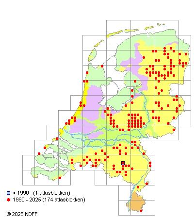 Het aantal atlasblokken (5x5 km) waarin de soort is gemeld binnen een periode van vijf jaar (vanaf 1980) of twintig jaar. Niet gecorrigeerd voor waarnemersinspanning en het aantal doorgegeven waarnemingen kan sterk variëren per periode, dus een trend in verspreiding kan hier niet direct uit worden afgelezen. Het opgegeven jaartal is het eerste jaar van de periode. Bron: gevalideerde waarnemingen uit de NDFF.